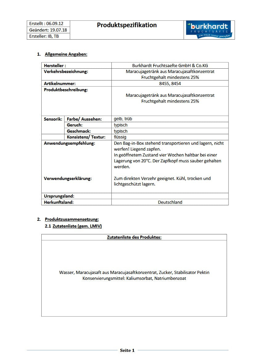 Wasser, Maracujasaft aus Maracujasaftkonzentrat, Zucker, Stabilisator Pektin