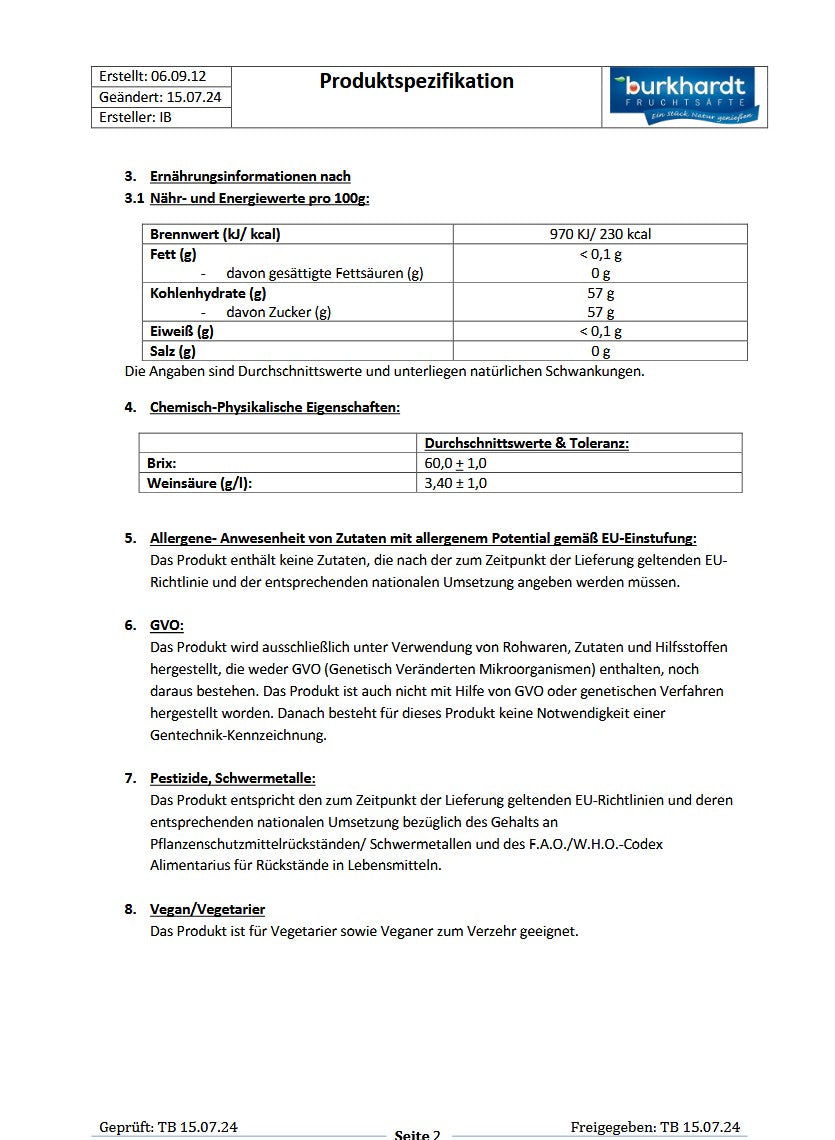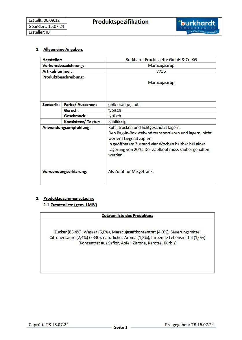 Zucker (85,4%), Wasser (6,0%), Maracujasaftkonzentrat (4,0%), Säuerungsmittel