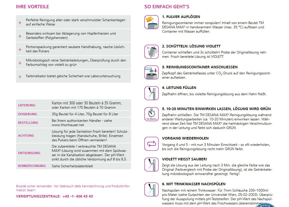 Der TM Desana Max FP Desinfektionsreiniger ist ein hochwirksames Reinigungsmittel für Saft- und Bierleitungen. Im praktischen 30er Pack mit je 45 g Beuteln sorgt er für zuverlässige Reinigung und Desinfektion von Schankanlagen, entfernt Ablagerungen, Biofilm und Rückstände und garantiert hygienisch einwandfreie Leitungen.